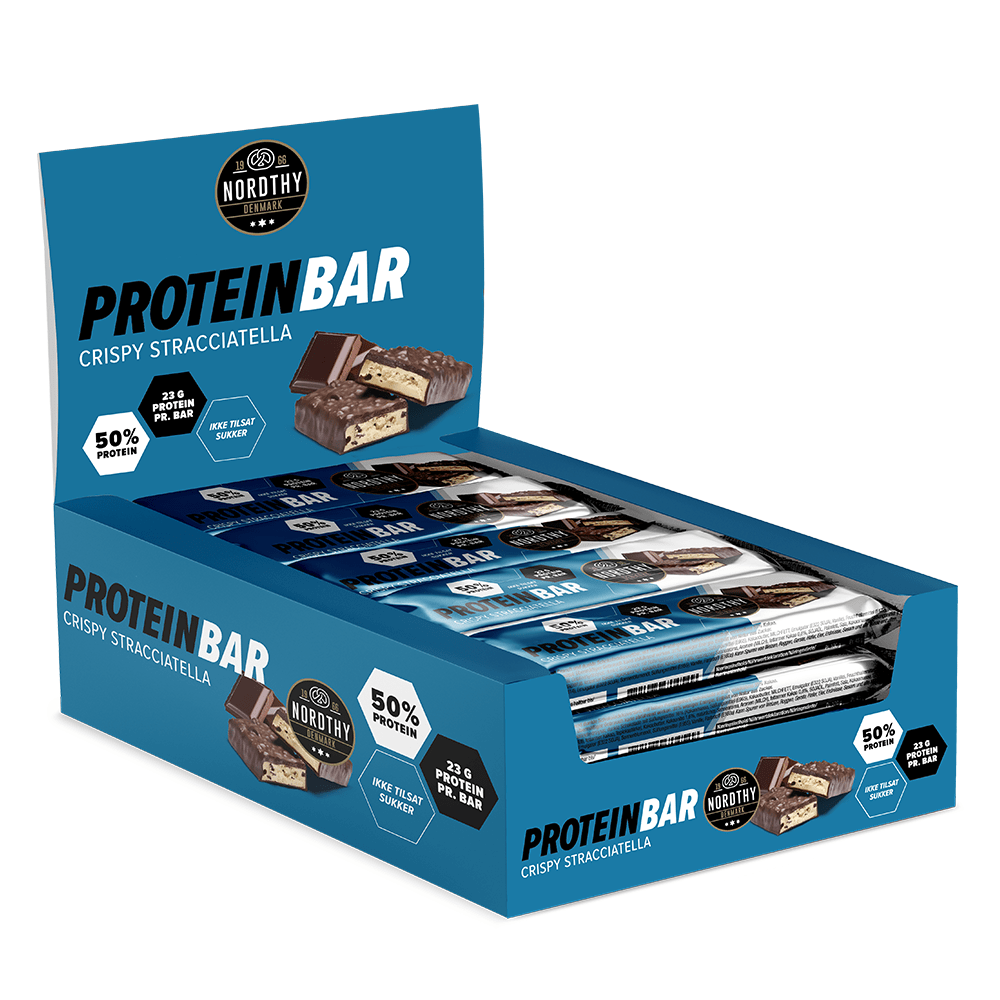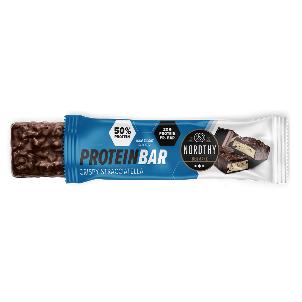 Crispy og lækker proteinbar med Stracciatella-smag overtrukket med Mørk chokolade. Proteinbaren indeholder 23 g. protein pr. bar. Perfekt til at have med på farten.